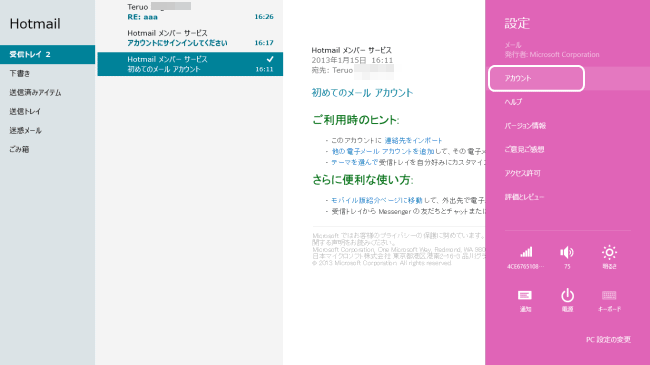 右側のチャームを起動し、設定、をクリック、アカウントをクリックします。